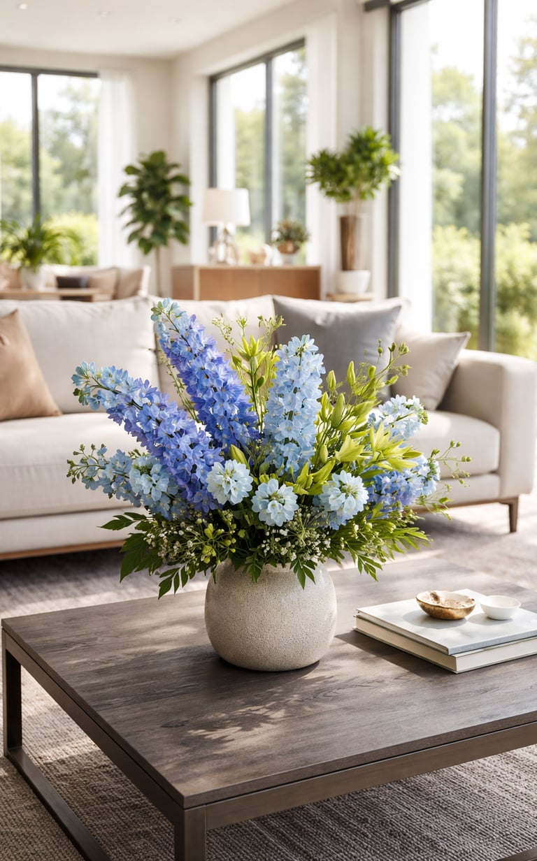Les fleurs invitent également à la découverte du détail et du mouvement. Un pétale qui se penche légèrement, un reflet de lumière qui traverse une feuille, un léger bruissement lorsque le vent caresse les tiges : tous ces petits instants transforment le quotidien en expérience sensorielle. Le mobilier minimaliste, les textures des tapis et des coussins, la chaleur du bois et la douceur du textile deviennent un écrin pour ces gestes subtils, magnifiant leur présence et leur poésie.