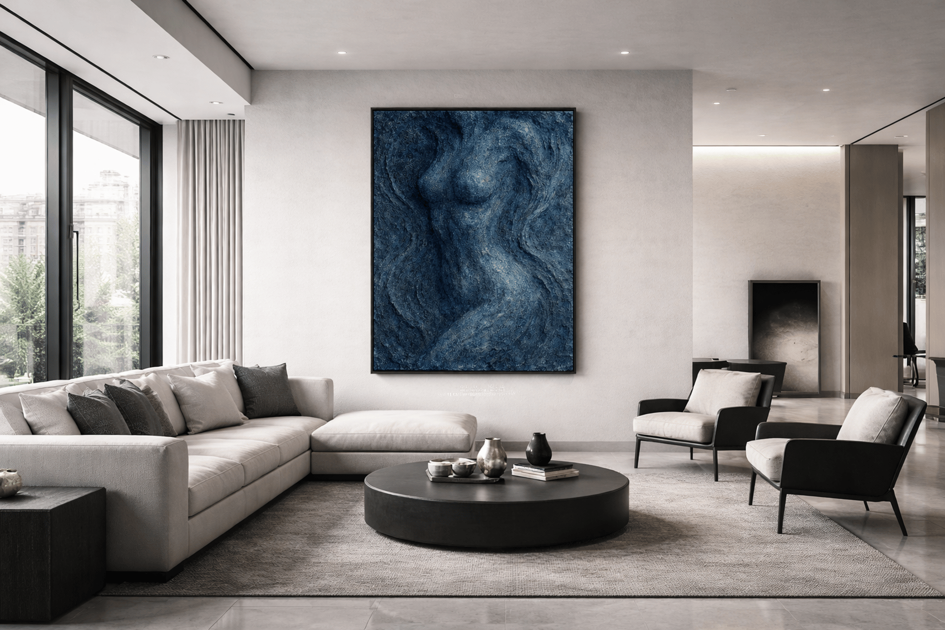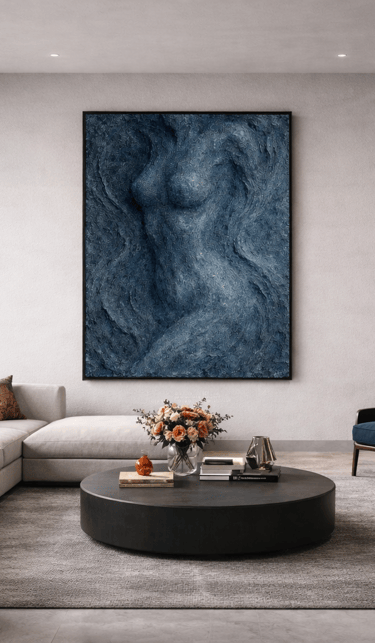 La couleur n’est pas décorative. Elle soutient la matière. Le bleu permet une profondeur calme, presque enveloppante. Il n’attire pas l’attention, il la contient. Dans un intérieur, cette couleur installe une continuité, une stabilité visuelle qui favorise une relation apaisée et durable avec l’œuvre.